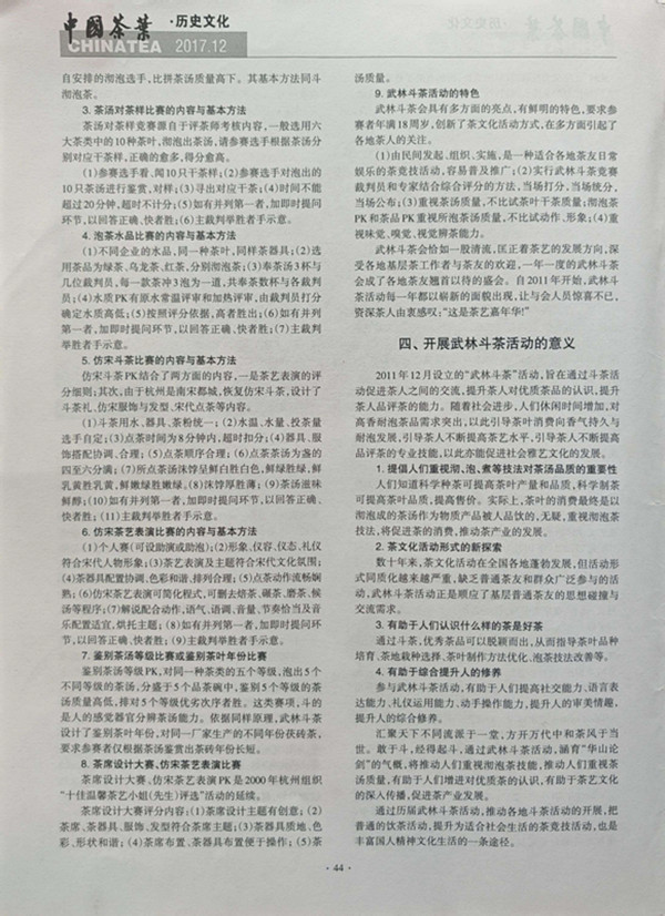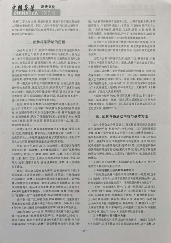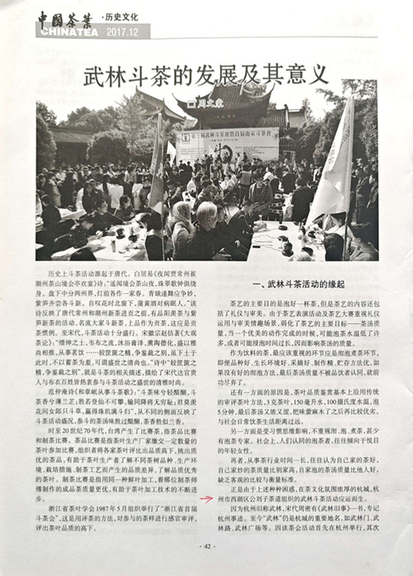 2017年第12期国家级《中国茶叶》杂志、与中国知网同步刊出著名茶道专家周文棠研究员的文章“武林斗茶的发展及其意义”,详细地介绍了杭州公刘子茶道2011年12月发起组织“武林斗茶会”的过程,2012年组织举办“第二届武林斗茶会”、2013年承办第三届武林斗茶会暨首届南宋斗茶会”、2014年承办“第四届全国武林斗茶大会暨首届中华茶奥会”、2015年组办“第五届国际武林斗茶会”等历史。对于海内外茶友欲了解“武林斗茶会”历史十分有帮助。