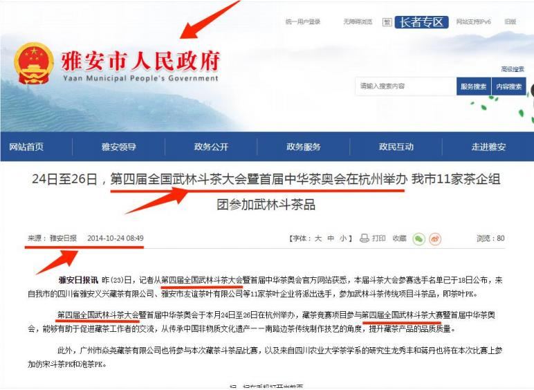 2014年10月24日雅安市人民政府官方网站刊出“第四届全国武 林斗茶 大会暨首届中华茶奥会在杭州举办,我市 11 家茶企组团参加斗茶 品 ”。